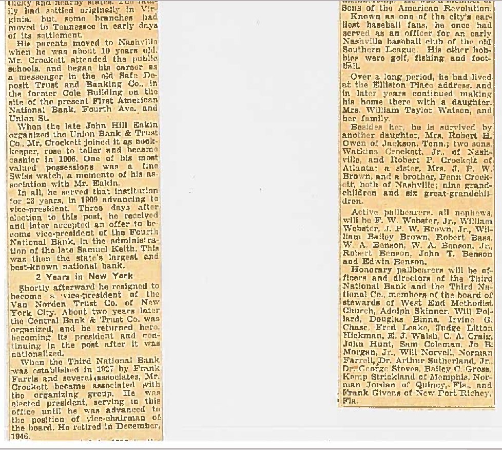 Bill was born in Nashville,TN in 1922 in his grandparents' home on Elliston Place as the first son of William Taylor Watson, Jr. and Mary Lee Crockett and grandson of Watkins Crockett, the first President of Third National Bank.