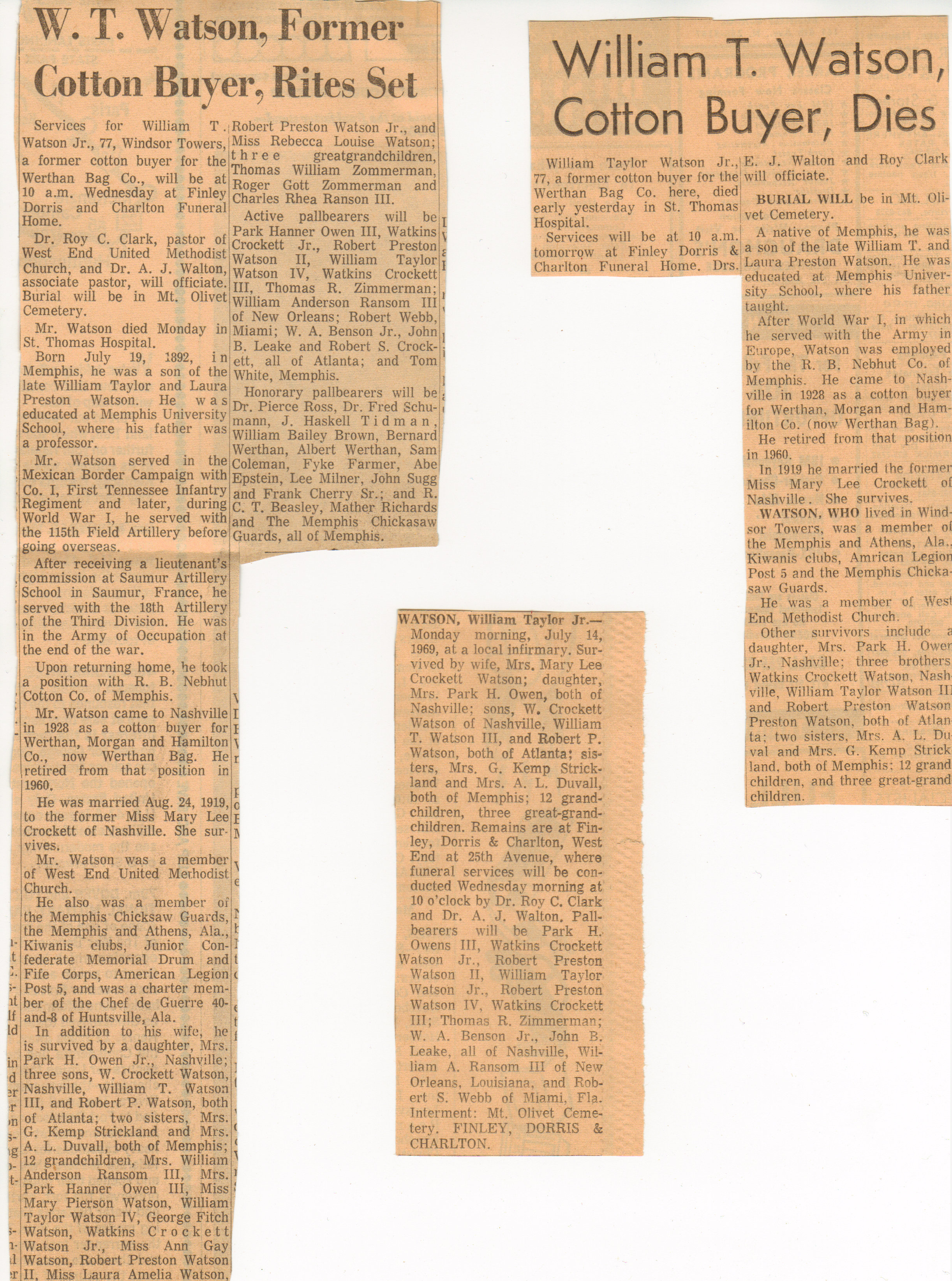 He was predeceased by his father, William Taylor Watson, Jr.; and mother, Mary Lee Crockett Watson; sister, Mary Lee Rogers Owen; and brother, Watkins Crockett Watson.